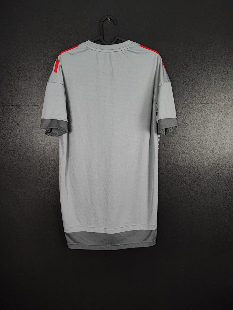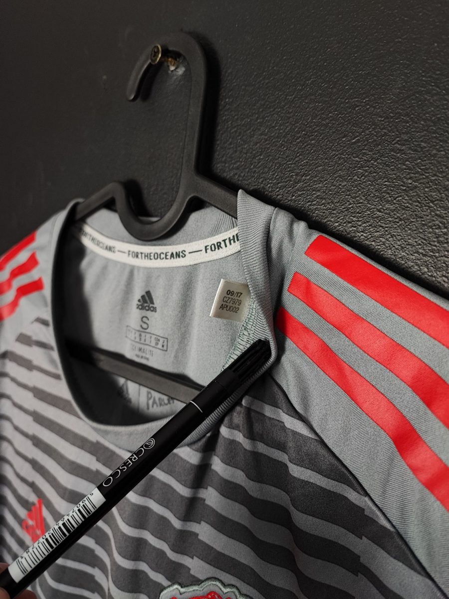 Koszulka przedmeczowa Czerwonych Diabłów, z sezonu 2017/18, wykonana w całości z odpadów pochodzących z dna oceanów.